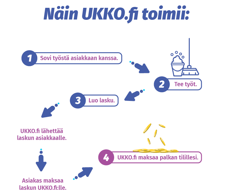 - Työn tekemisen jälkeen kevytyrittäjä luo laskun UKKO.fi-palvelussa omalla UKKO-tilillään. UKKO.fi toimittaa laskun kevytyrittäjän asiakkaalle.