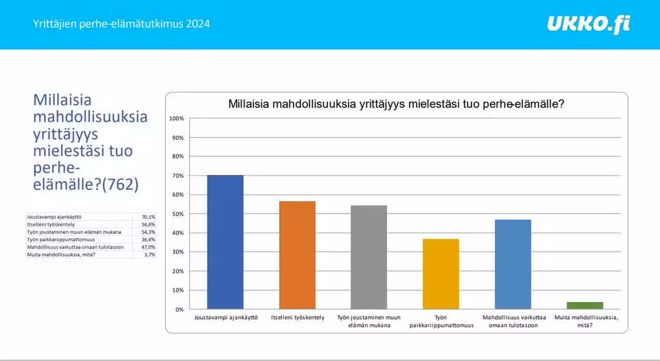 Yrittäjyyspalvelu UKKO.fi tutki keväällä 2024 yrittäjien ajatuksia perhe-elämän ja yrittäjyyden yhdistämisestä. Kyselyn mukaan yrittäjyys mahdollistaa joustavamman ajankäytön perhe-elämälle. Yrittäjyyden tuomat haasteet perhe-elämän osalta painottuvat taloudellisiin kysymyksiin. Kyselyyn osallistui yhteensä 762 vastaajaa.